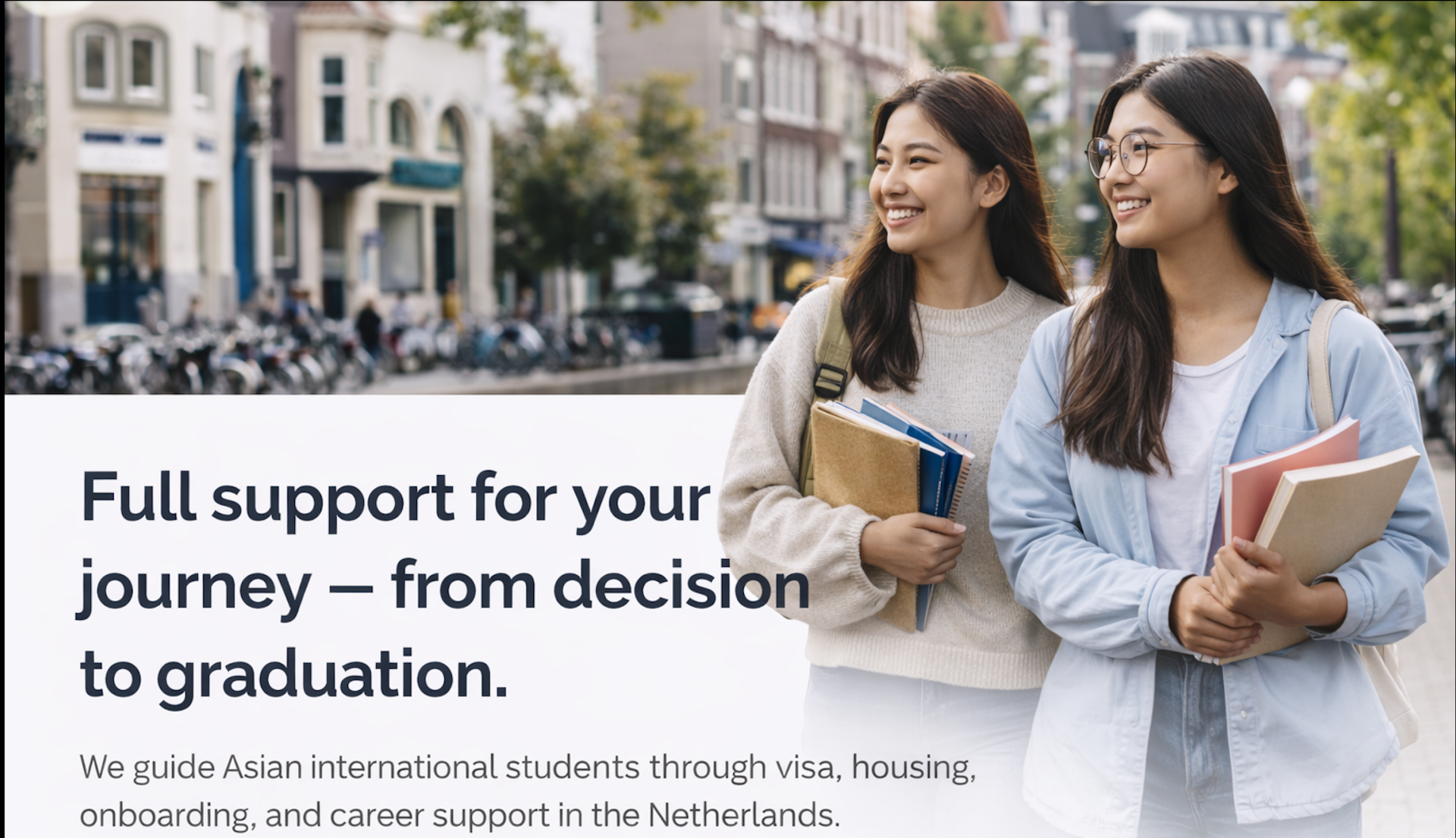 We support Asian international students at every stage of their journey to study in the Netherlands. From making the first decision to move abroad to successfully graduate and building a future career, our platform provides trusted guidance, verified housing, scam prevention tools, visa support, onboarding assistance, and a welcoming community. Our goal is to reduce uncertainty, simplify complex processes, and help students feel confident, safe, and connected throughout their entire experience.